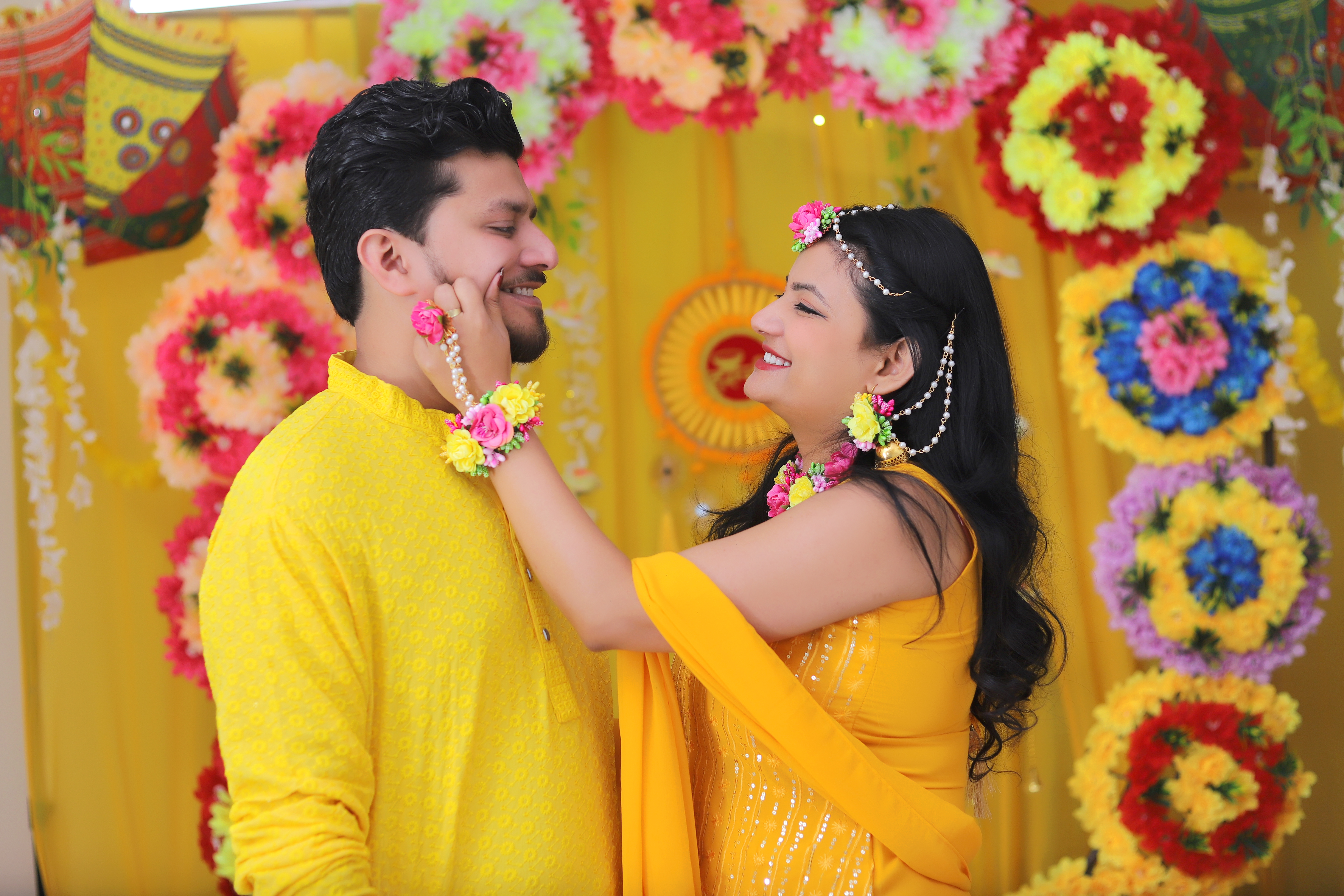 Capture the playful and romantic moments of the bride and groom during the Haldi ceremony with vibrant, heartfelt portraits.